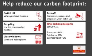 With increasing legislative focus on reducing energy & carbon, Royal Mail needs to look at how the organisation can become more energy efficient. Looking at how the company uses energy at its offices and sites and the impact the organisation’s actions or inactions have is an important step in improving RMG’s energy efficiency, which in turn will help to improve its reputation as a responsible business as well as save money.