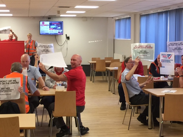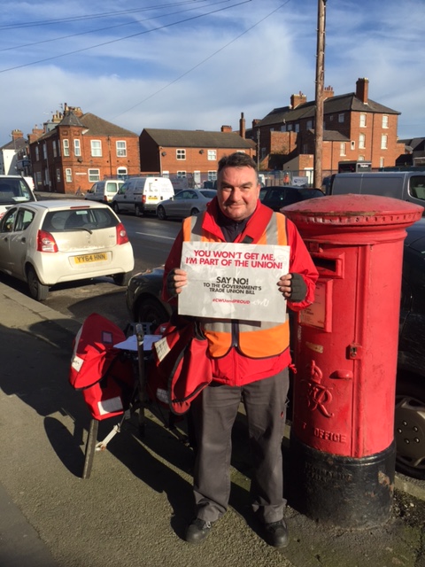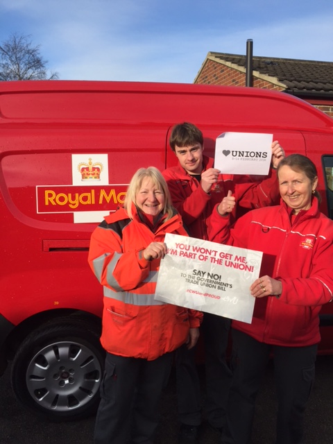 February 12 2016Hull and East Ridings area delivery rep Andy Parrish sent in these photos showing local members standing united against the Trade Union Bill. “The whole range of our membership – delivery, MGV drivers, Parcelforce drivers, Romec workers and fleet services – supported the CWU Action Day yesterday. Up here, we’re 100 per cent CWU and Proud,” he said.
